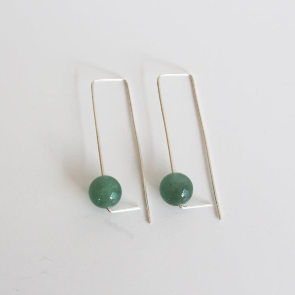 Statement earrings that are so light they can be worn every day. Sterling silver ear wires hold a 10mm sphere of green aventurine Over all length 4.5 cm.