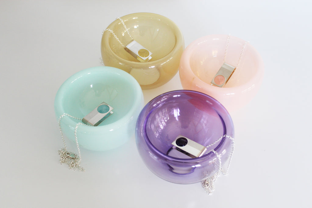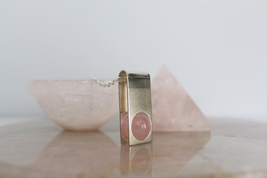 A sphere of rose quartz is held in a folded rectangle of sterling silver, allowing it to orbit freely. Each pendant features a brushed surface design and is suspended from a sterling silver chain.